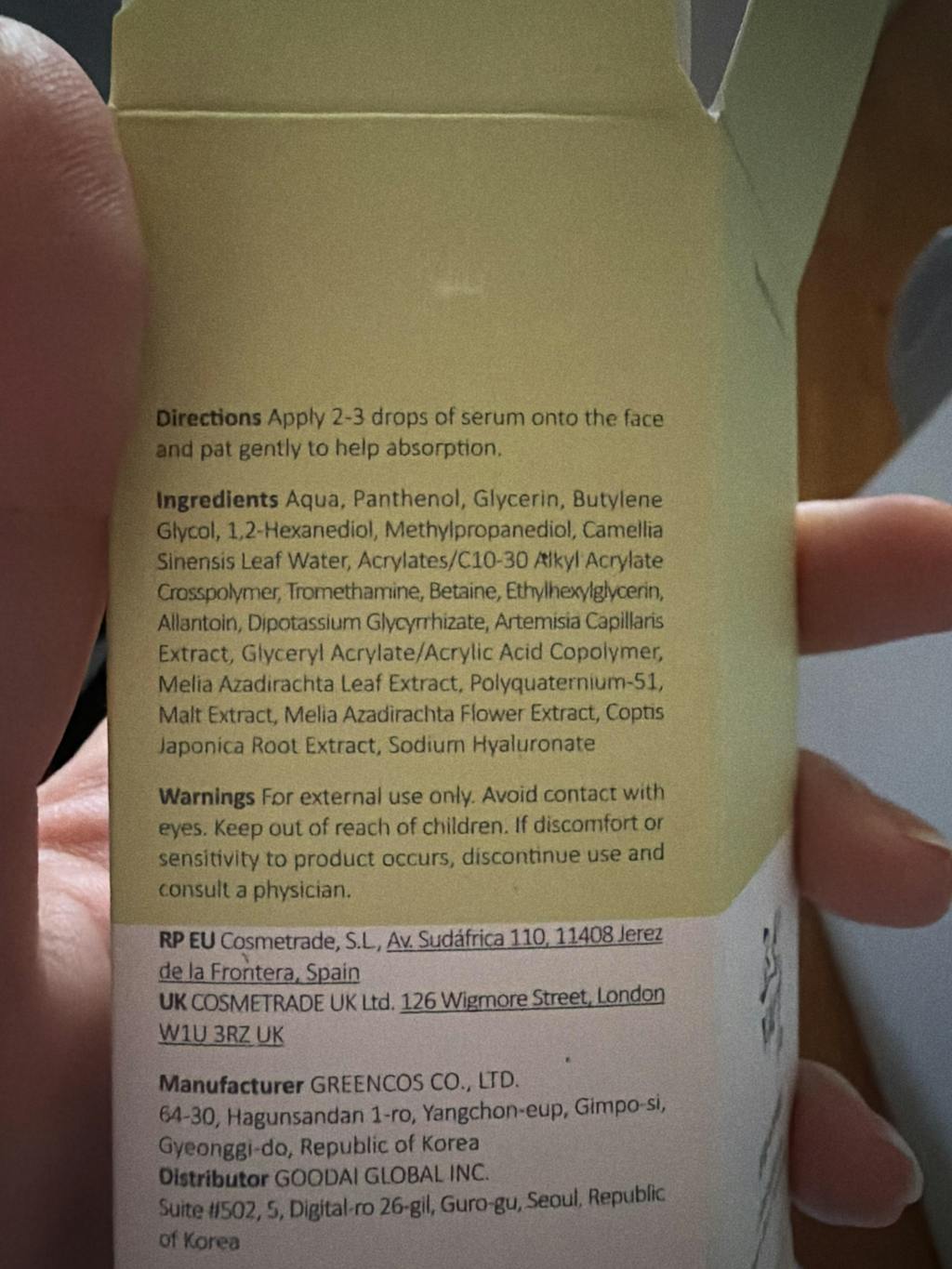 Ingredients is a bit other. It has less amount of green tea and mugwort inside and more water, panthenol and butylene glycol. Maybe it can works for somebody who hasn’t red cheeks, which should be calm down. For me Kaine cremes works better. May be other web stores have the Produkt with the better ingredients. The ingredients list should be listed from more to less and under 1% can be everywhere.